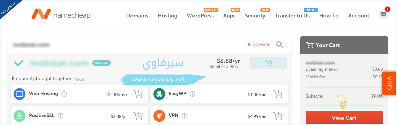 الخطة الرابعة – بعد الضغط على زر الأضافة إلى السلة، سيظهر لك بعض الأختيارات والأضافات التي قد تكون بحاجة إليها، ويتم عرضها إليك بسعر مخفض كـ شهادة ssl و استضافة المواقع و البريد الإلكتروني الخاص بموقعك وخدمة الـ VPN وغيرهامن الخدمات، إذا وجدت أنك لست بحاجة لأي من تلك الخدمات الإضافية، فقط قم بالضغط على كلمة View Cart كما هو موضح في الصورة التالية.